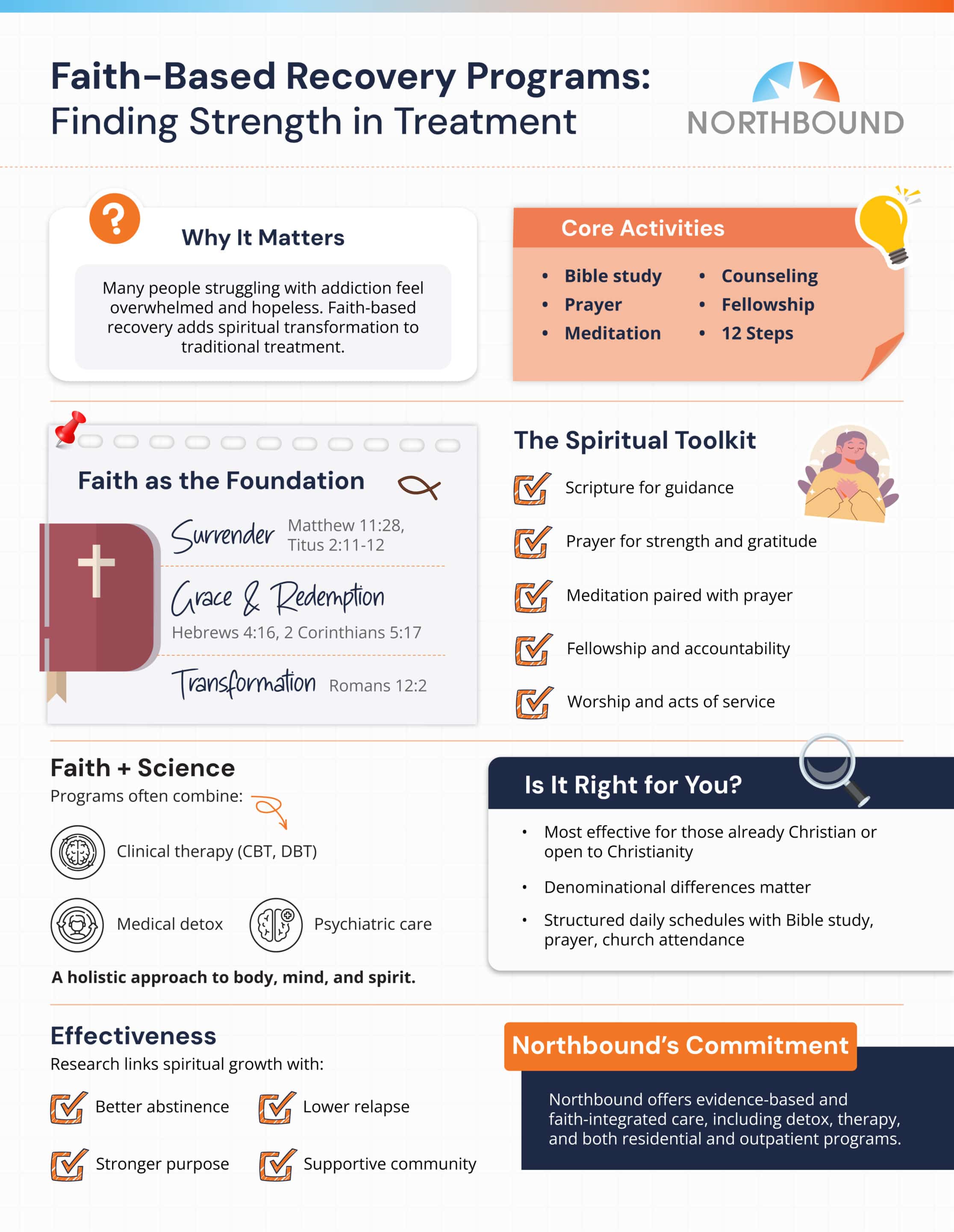 - The Synergy: The focus in faith-based approaches is to treat the whole person—body, mind, and spirit. Faith provides the “why” for recovery, and science provides effective “how-to” strategies.